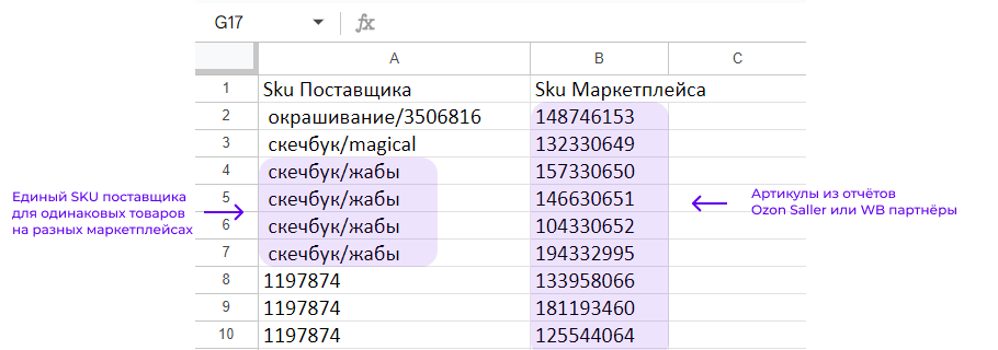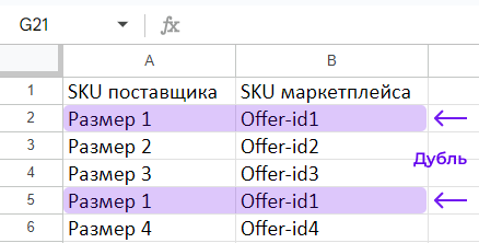 Избегайте дублей — это когда SKU маркетплейса и SKU поставщика повторяются. Например, вот так: