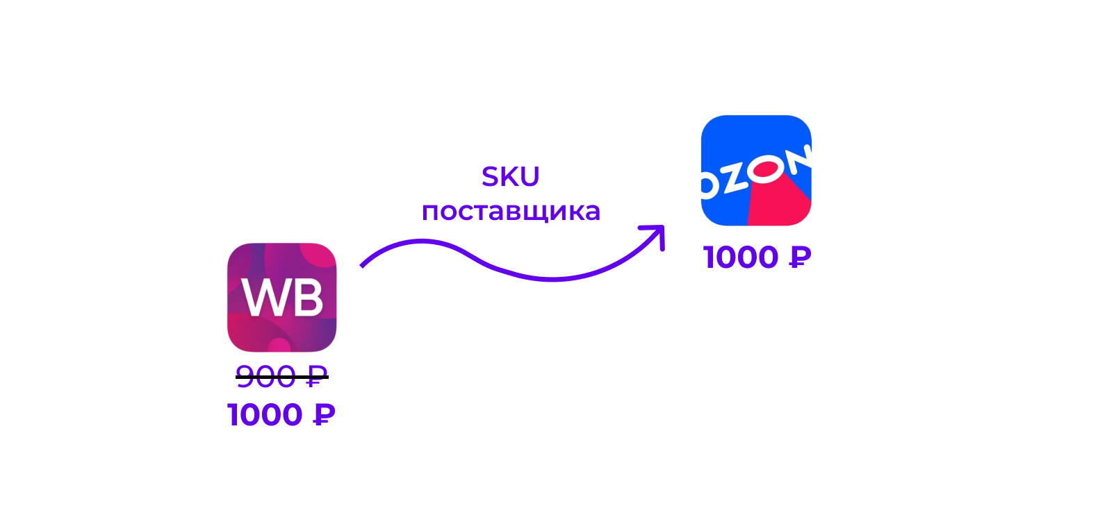 Кросс-маркетплейс связывает одинаковые товары на нескольких площадках с помощью единого SKU поставщика. Таким образом, кросс-маркетплейс изменяет цены на обоих площадках в соответствии со стратегией. Например, стратегией следования за ценами WB или следование за ценами Ozon.