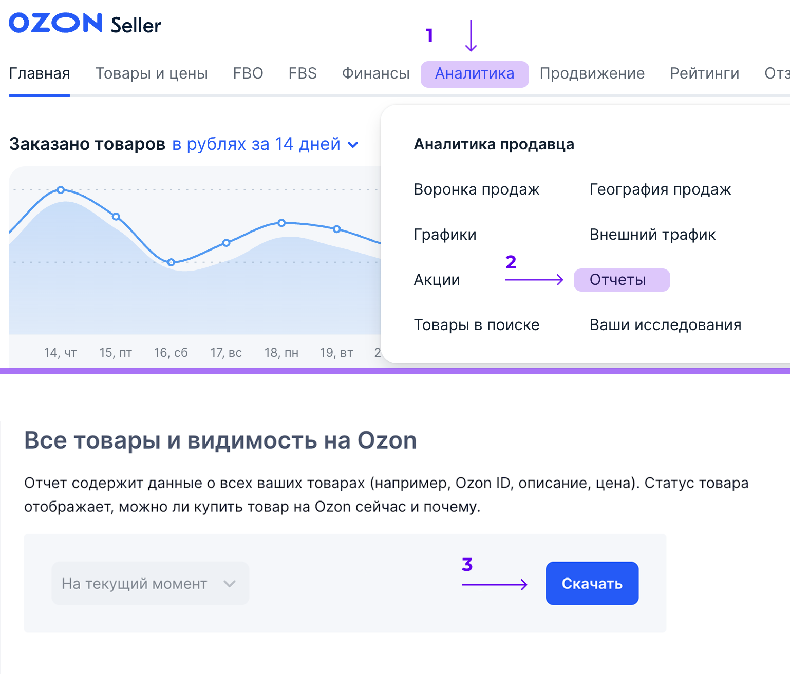 Чтобы выгрузить артикулы из аналитического отчета, перейдите в «Аналитику» — «Отчёты», нажмите «Скачать отчёт» и скопируйте «Артикулы Ozon» из первого столбца.