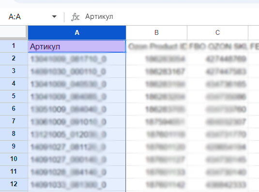 • Для файла Ozon — это артикулы из аналитического отчёта «Ozon Seller»;