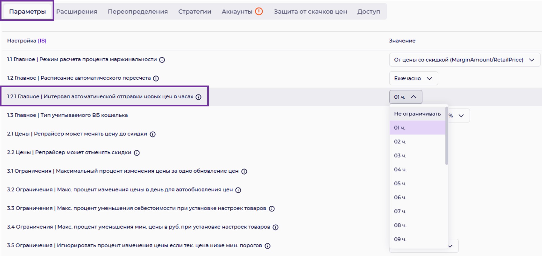 1.2.1 Главное |Интервал автоматической отправки новых цен в часах.