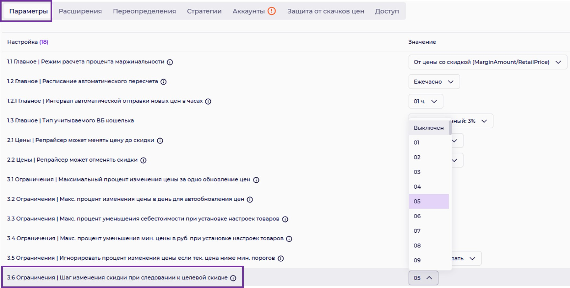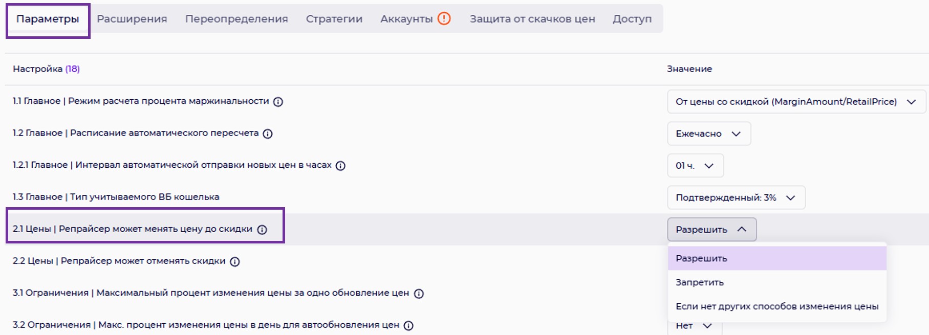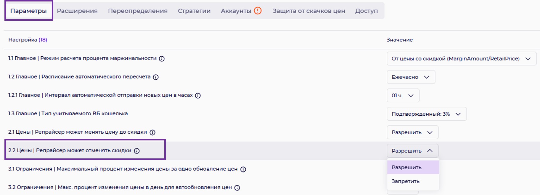 2.2 Цена | Репрайсер может отменять скидки.