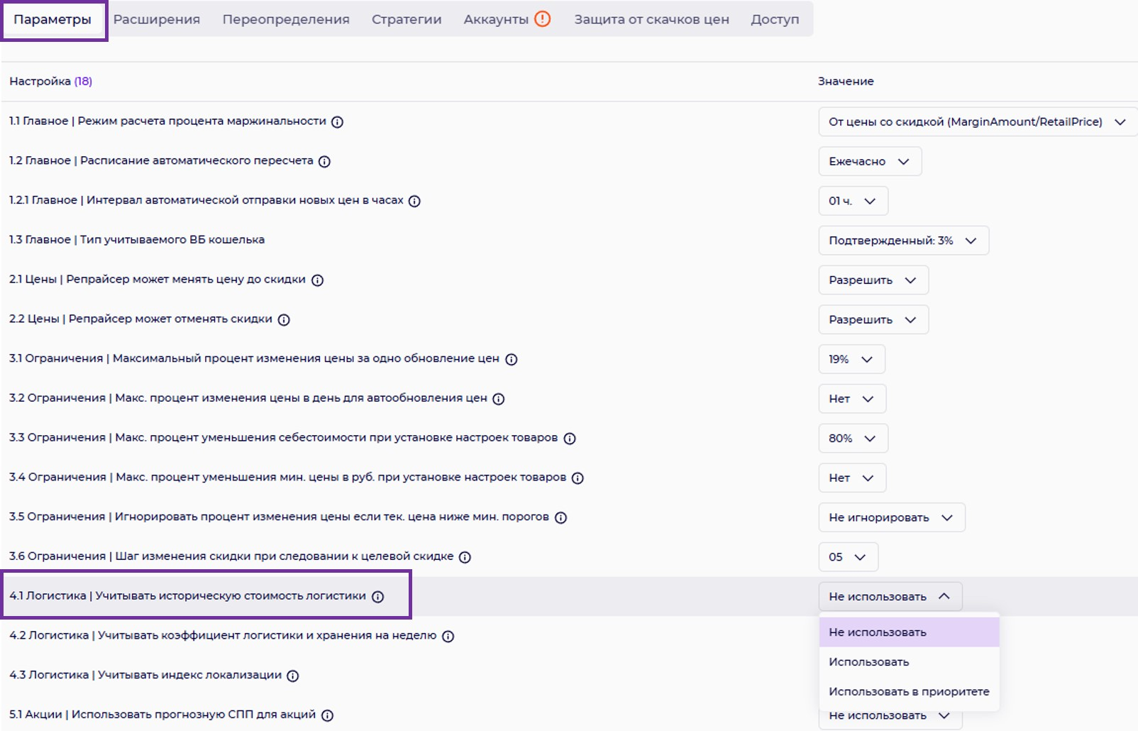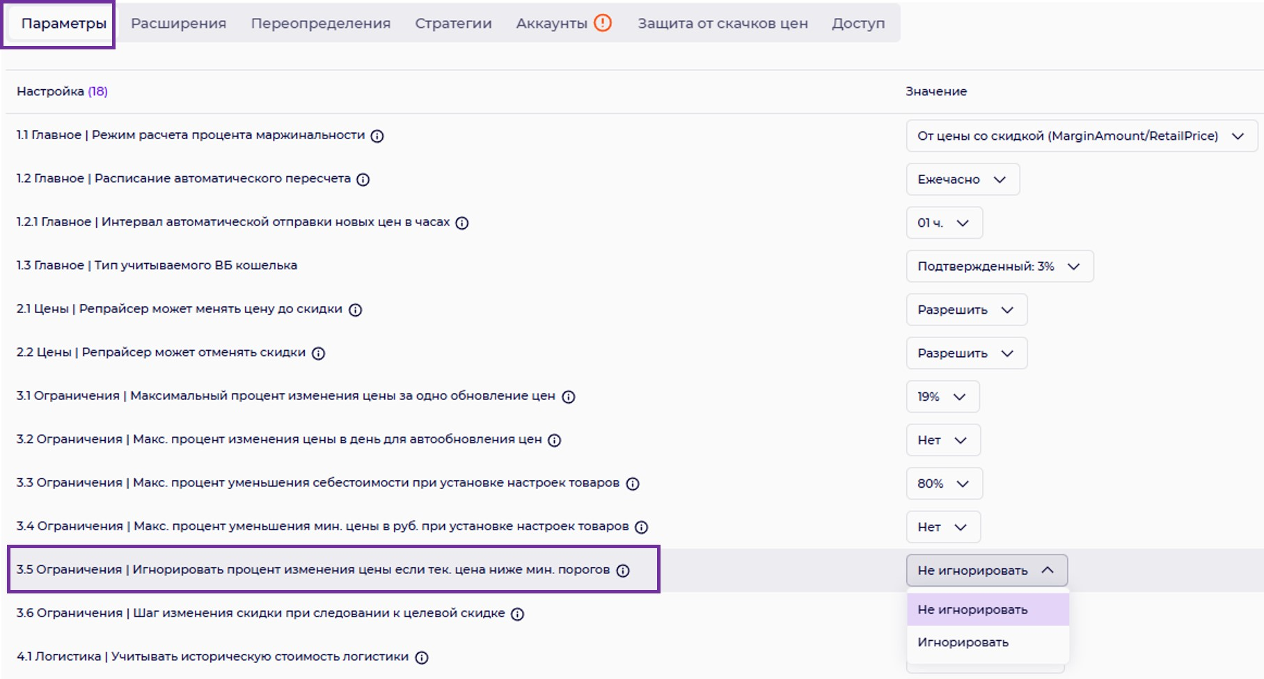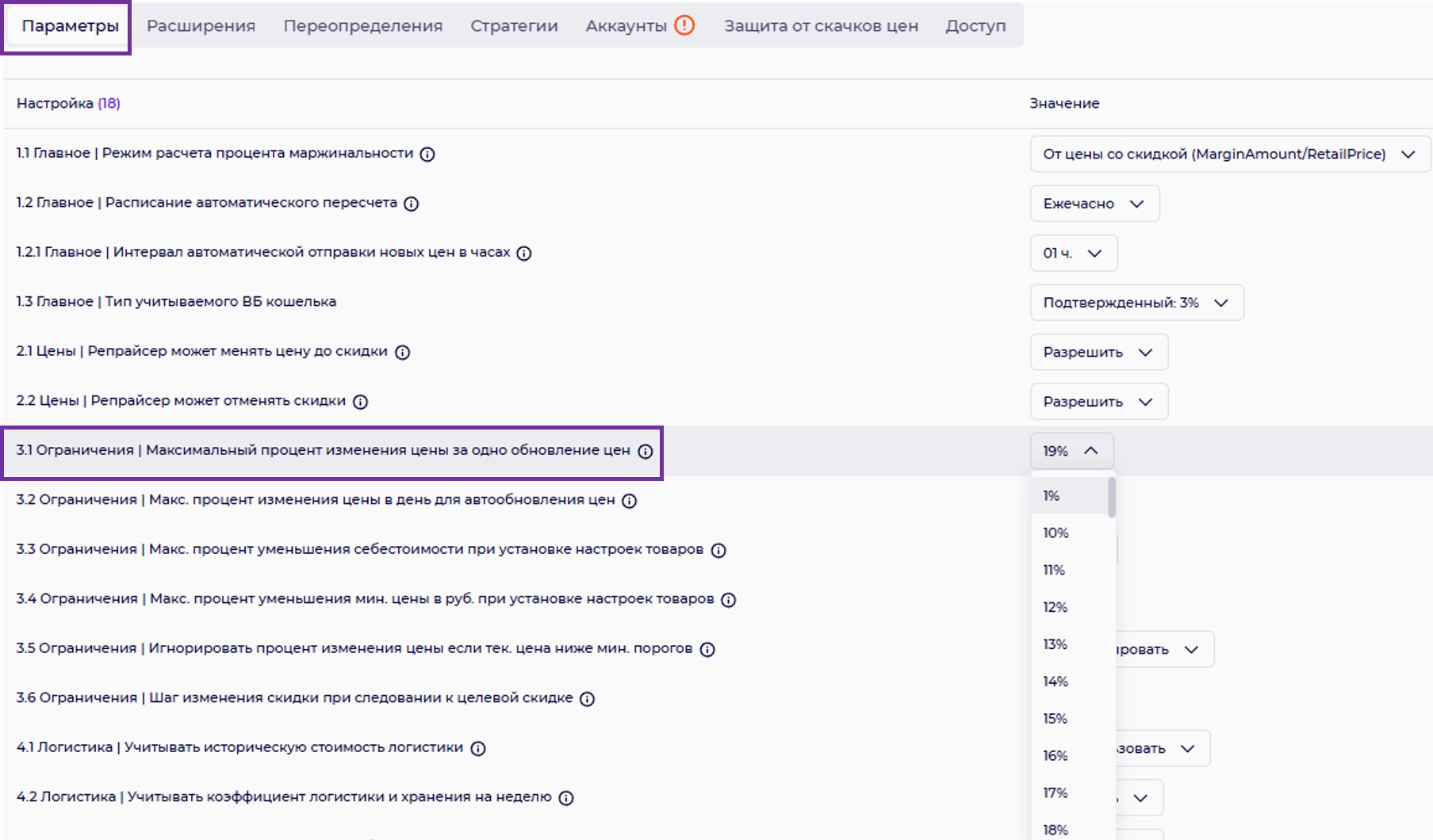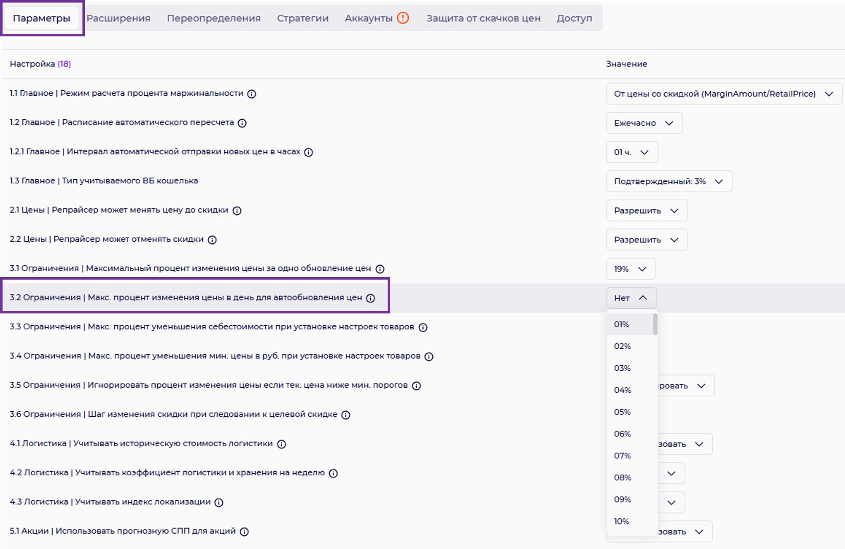 3.2. Ограничения |Максимальный процент изменения цены в день для автообновления цен.