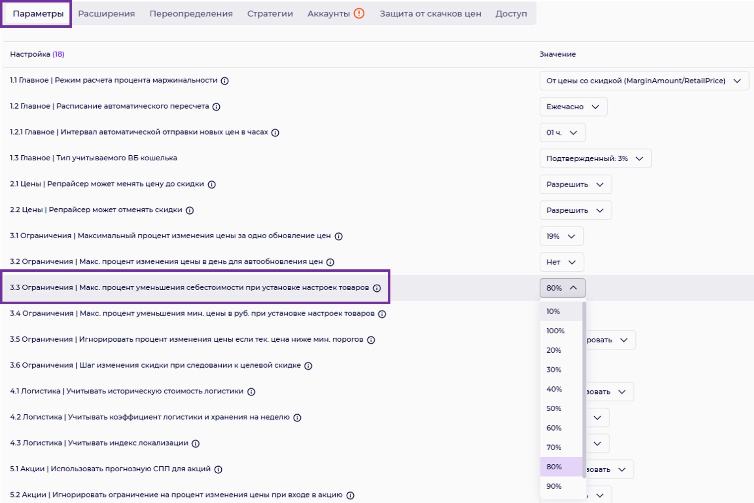 3.3 Ограничения |Максимальный процент уменьшения себестоимости при установке настроек товара.