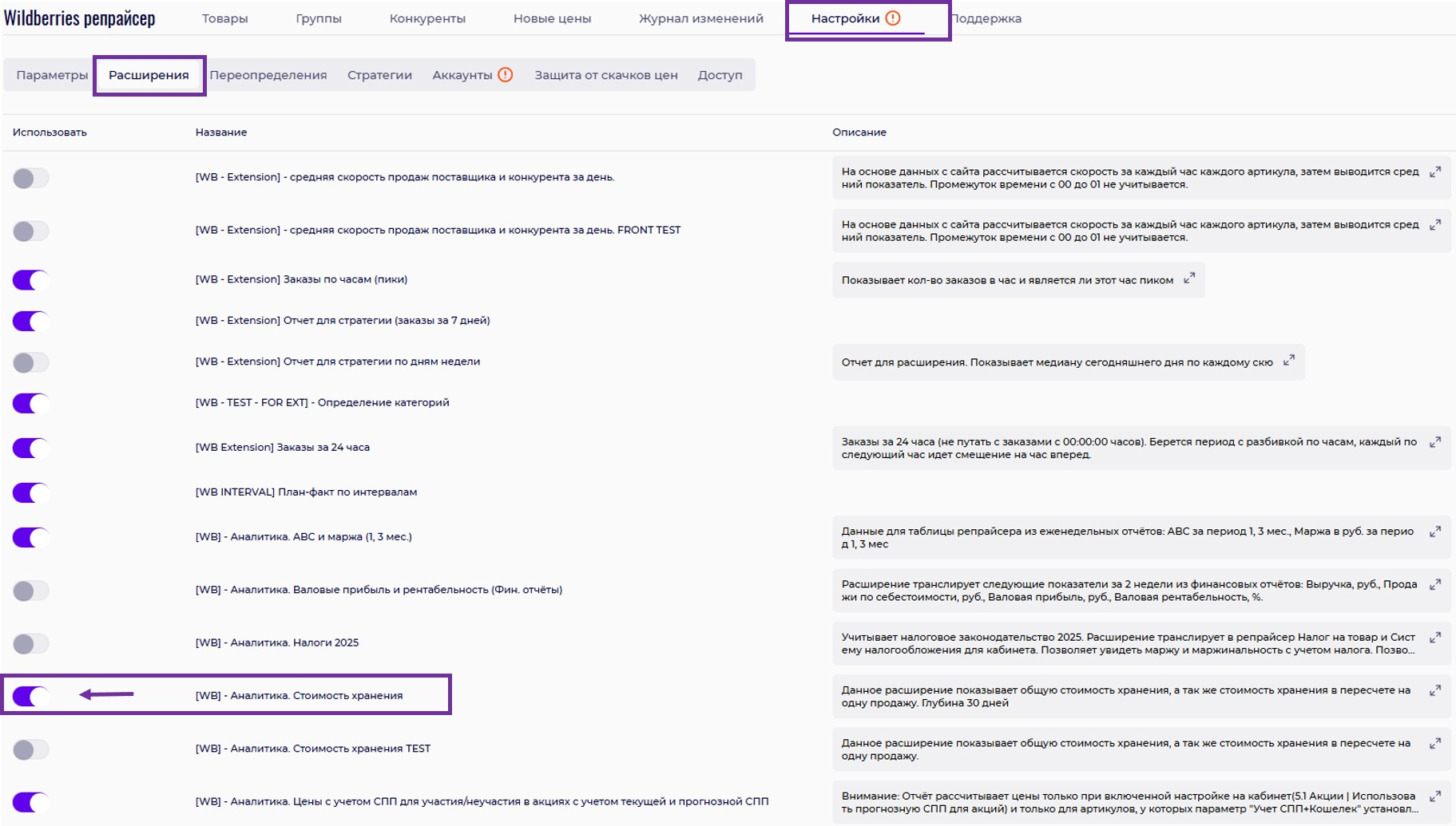 Подключите базовые расширения в разделе «Расширение». Они покажут вам какой товар приносит больше всего прибыли, сколько стоит хранение каждой позиции, какие товары нужно продавать быстрее. После подключения в списке товаров появится новый столбец с этой информацией.