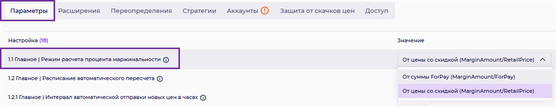 1.1 Главное | Режим расчета процента маржинальности