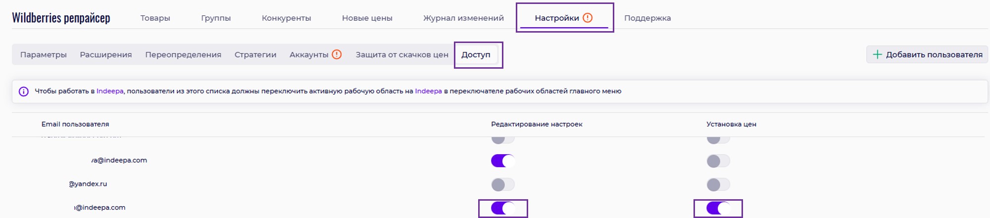 У вас обязательно должен быть доступ к репрайсеру WB. Для этого администратору необходимо зайти в репрайсер Indeepa во вкладку «Доступы». Около своей почты включите два ползунка — «Установка цен» и «Изменение настроек».