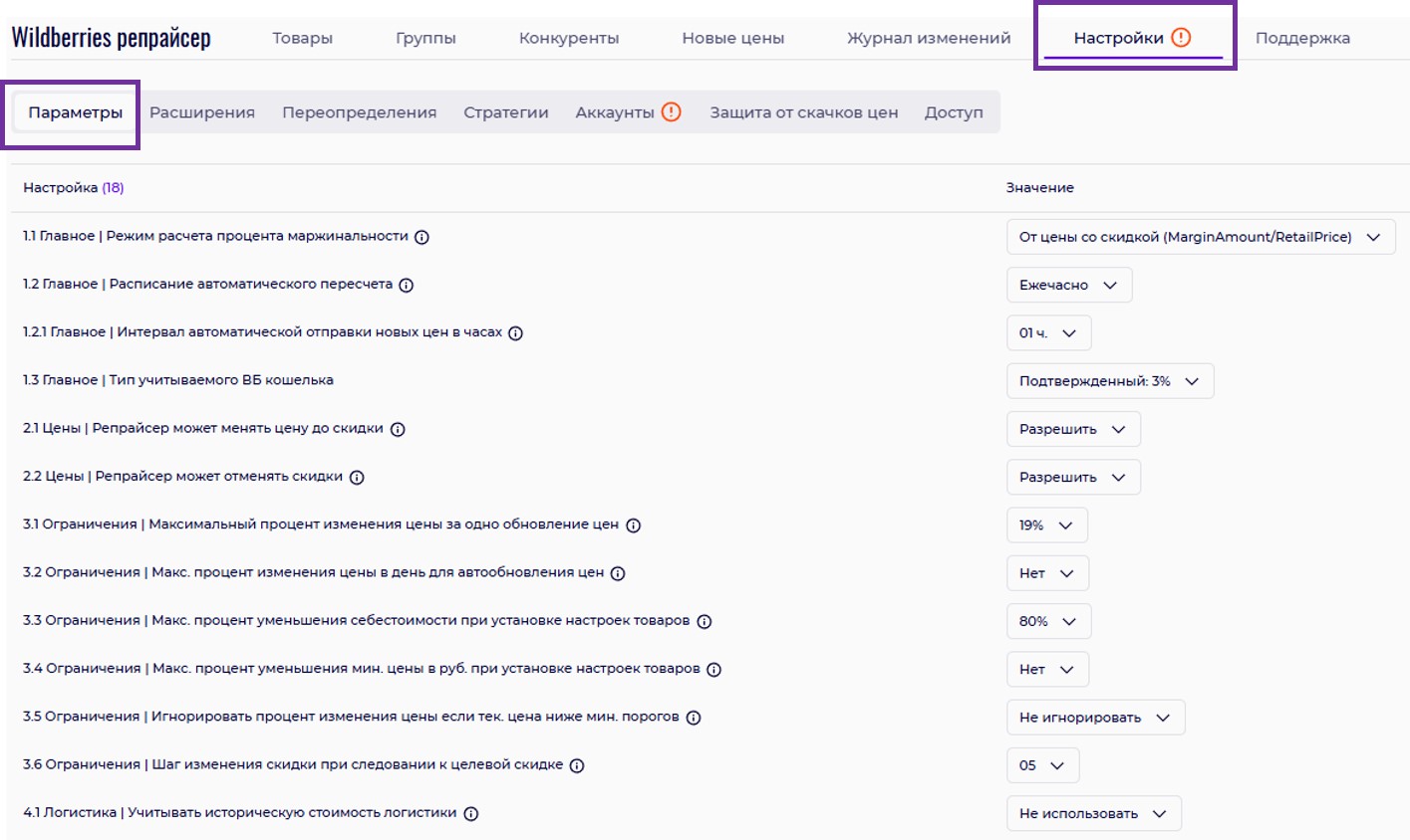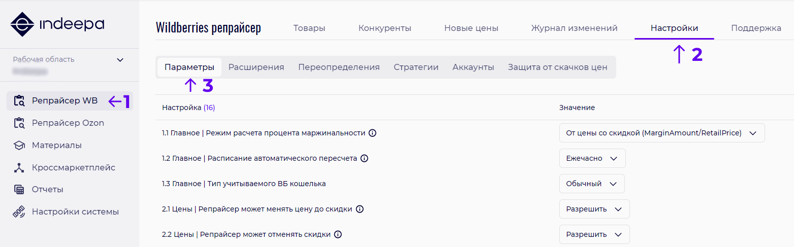 В этом материале описаны базовые параметры репрайсера, которые необходимо настроить, чтобы начать управлять ценообразованием через репрайсер Indeepa для Wildberries.