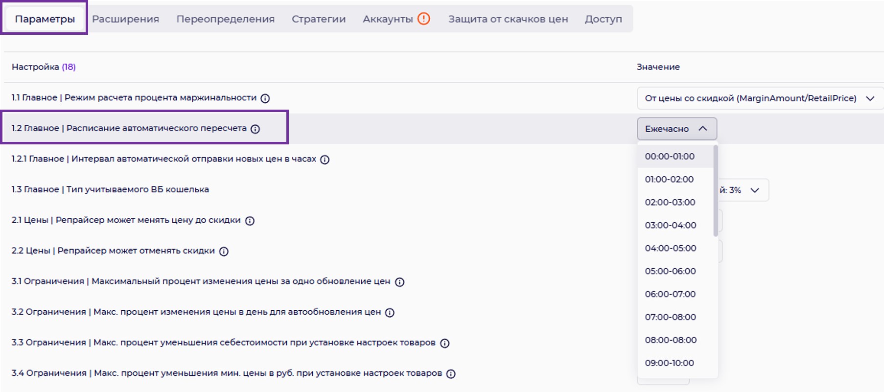 1.2 Главное |Расписание автоматического пересчета.