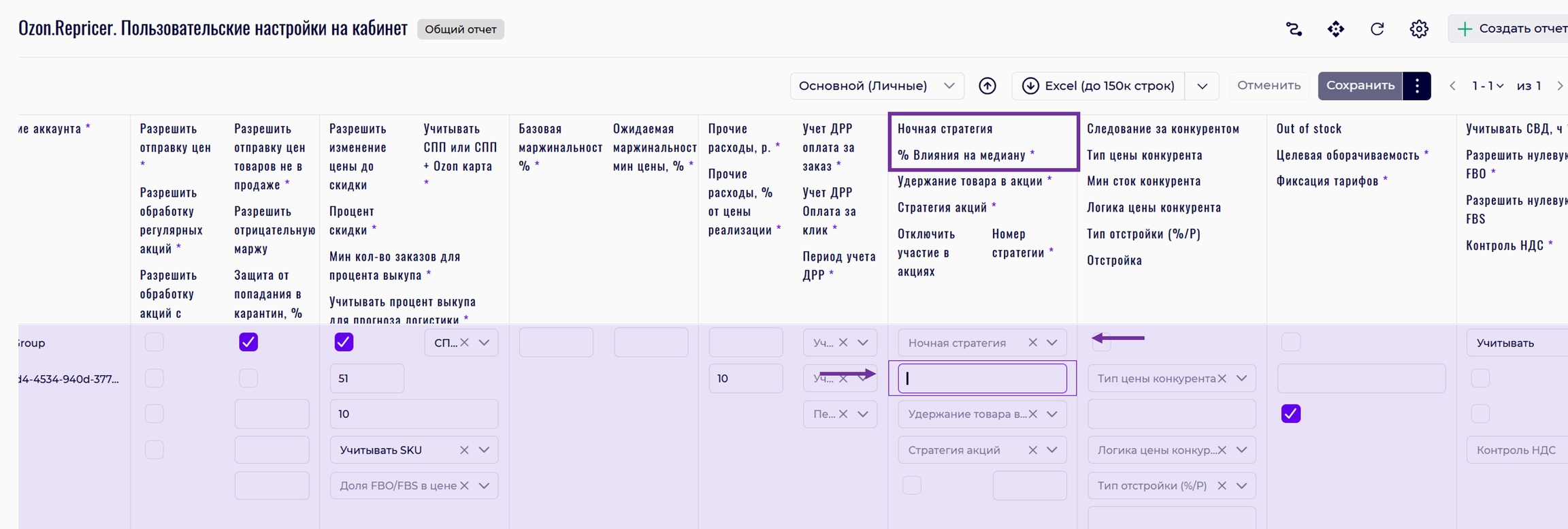 При необходимости вы можете подключить «Ночную стратегию» ко всем товарам в кабинете. Для этого активируйте её в разделе «Ozon. Repricer. Пользовательские настройки на кабинет». После подключения нажмите кнопку «Сохранить».