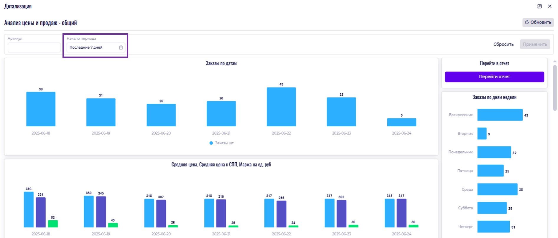 Введите артикул, по которому хотите провести анализ, и выберите интересующий вас период. В данном отчёте вы можете выбрать любой период — даже если первое число месяца приходится на воскресенье. Нажмите «Применить».
