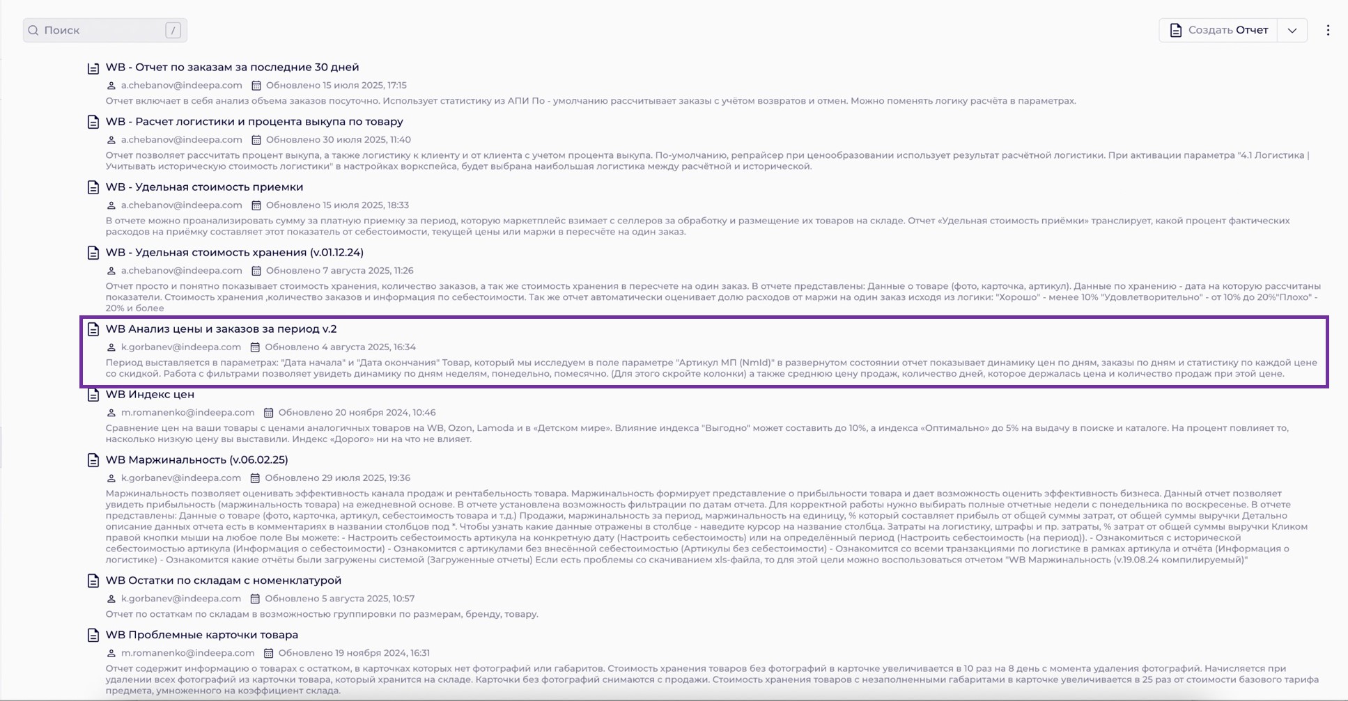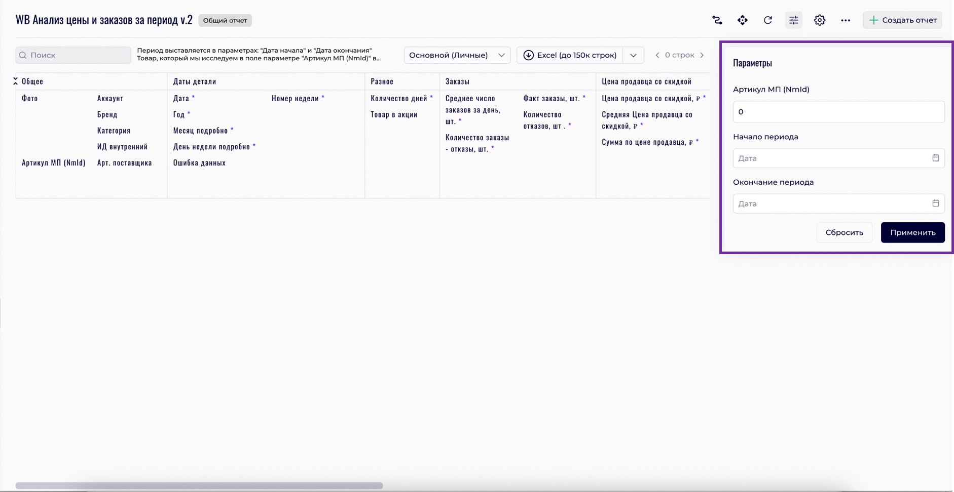 Перейдите в «Отчёты» → «Стандартные отчёты Indeepa» → «Wildberries» → «WB Анализ цены и заказов за период v.2»