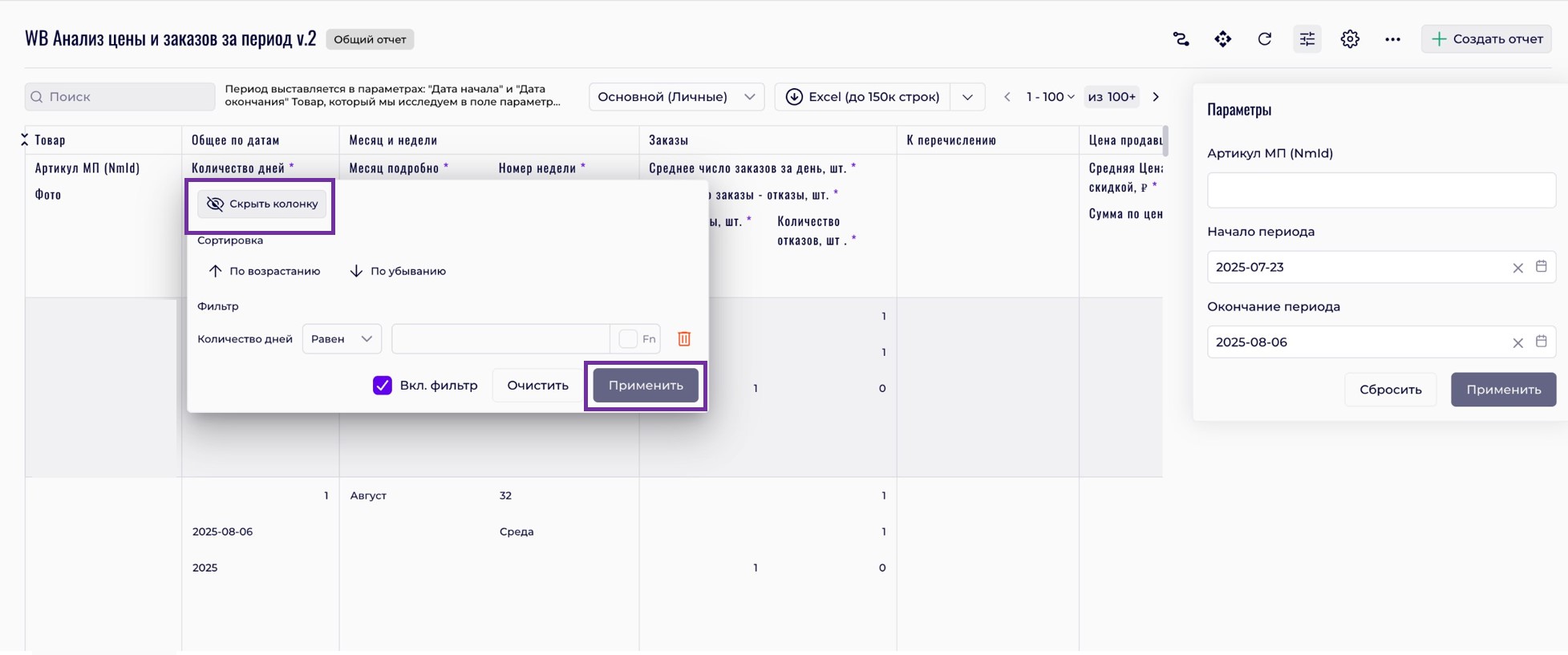 Для этого щелкните левой кнопкой мыши на нужное значение в шапке таблицы, затем выберите «Скрыть колонку» и нажмите «Применить». Повторите эту операцию для всех значений, перечисленных выше.
