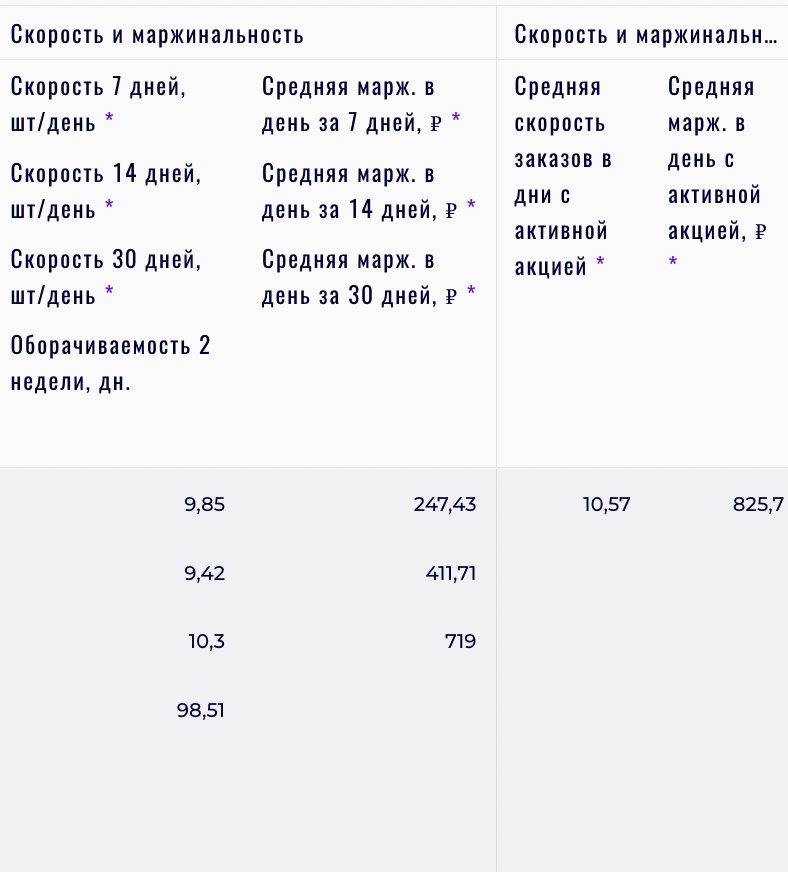 В данном разделе вы можете отслеживать скорость, оборачиваемость и маржинальность — чтобы понять, как участие в акциях влияет на ключевые показатели по артикулу.