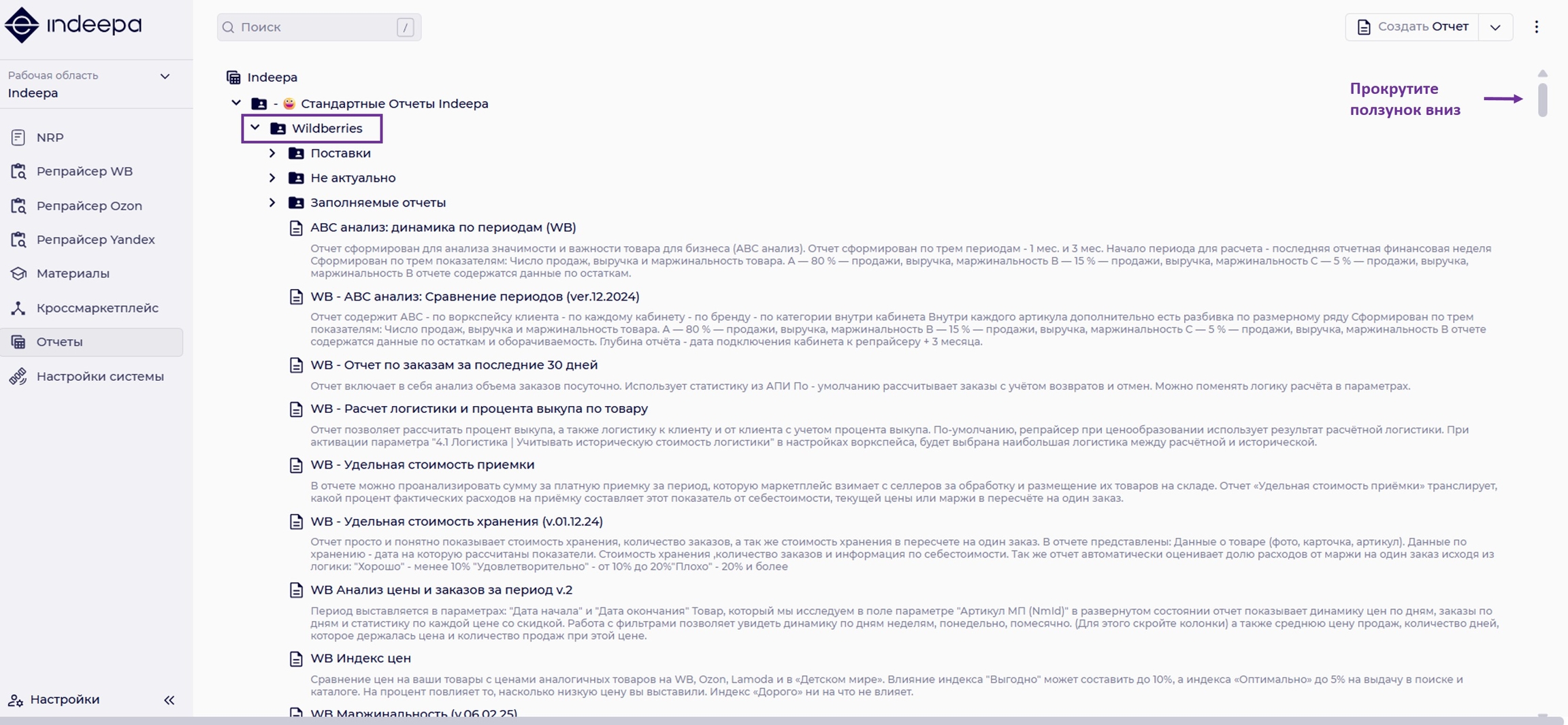 2. Откройте в левом меню репрайсера «Отчеты», далее выберите отчет «WB. Расчет маржи для участия в акциях 2.1»