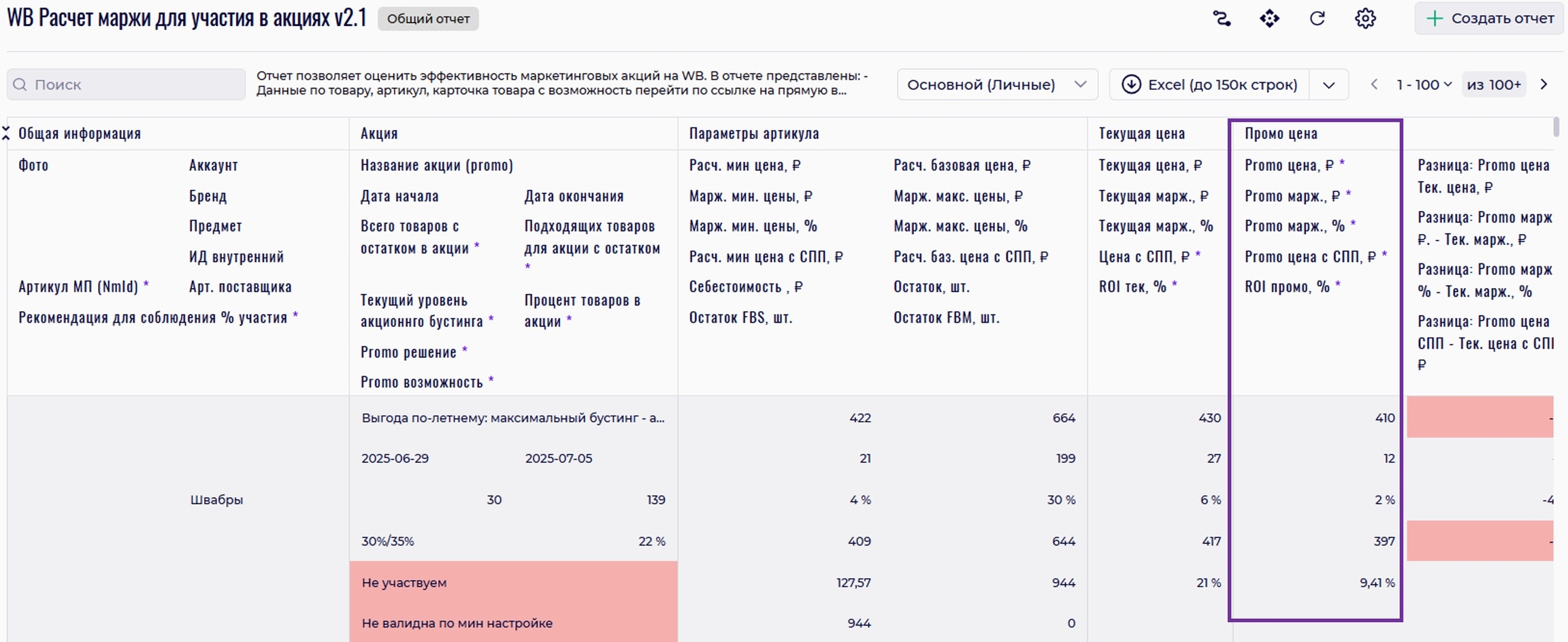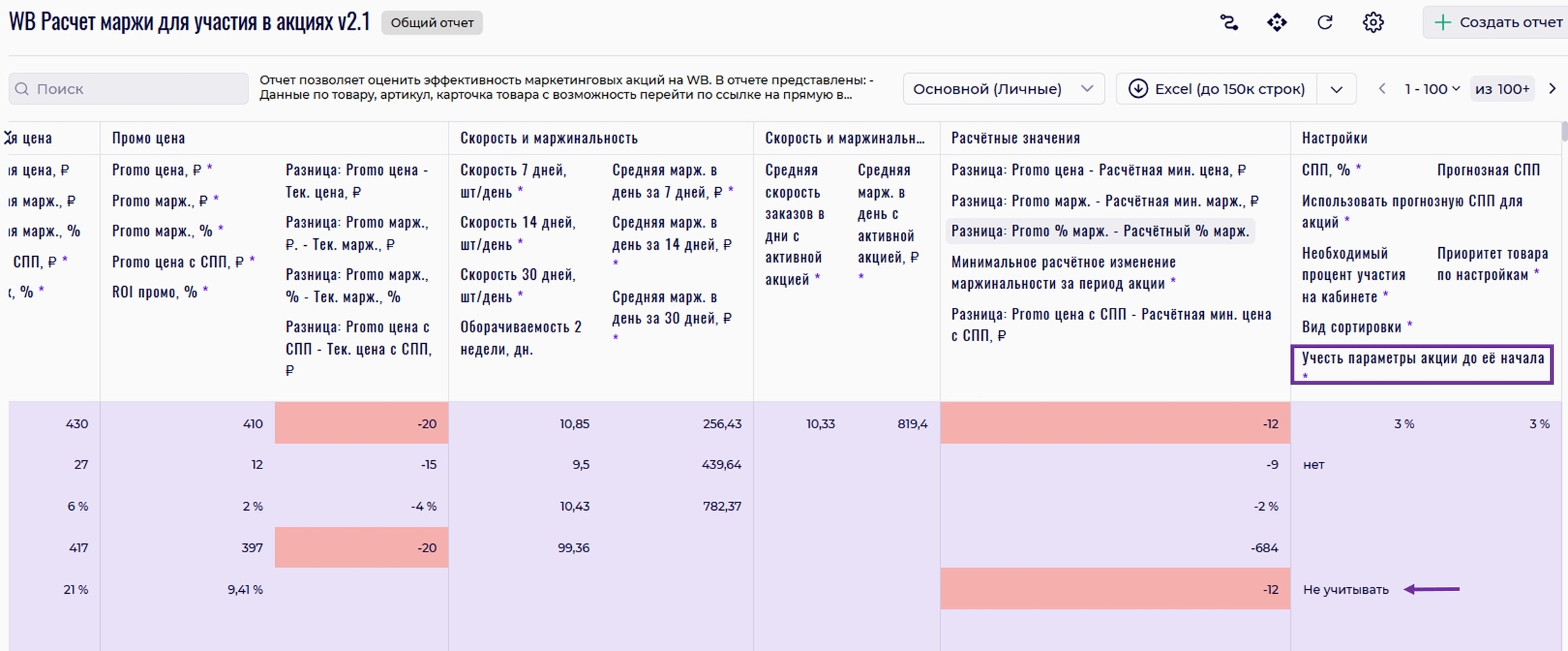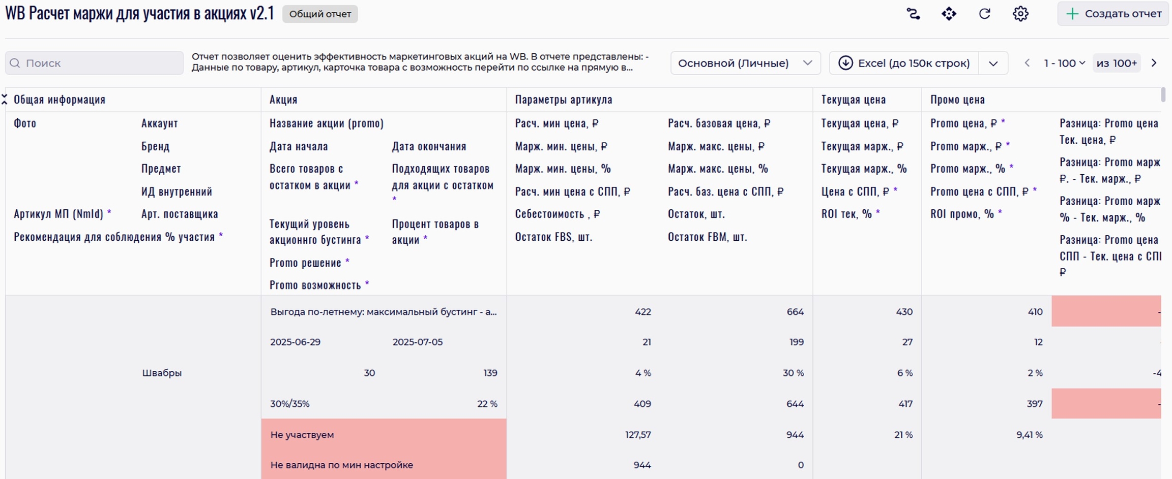 Расчёт маржи для участия в акциях — отчёт, в котором можно просматривать доступные акции, заранее настраивать параметры будущих акций, планировать количество артикулов всего кабинета, участвующих в акциях, и порядок их проведения.