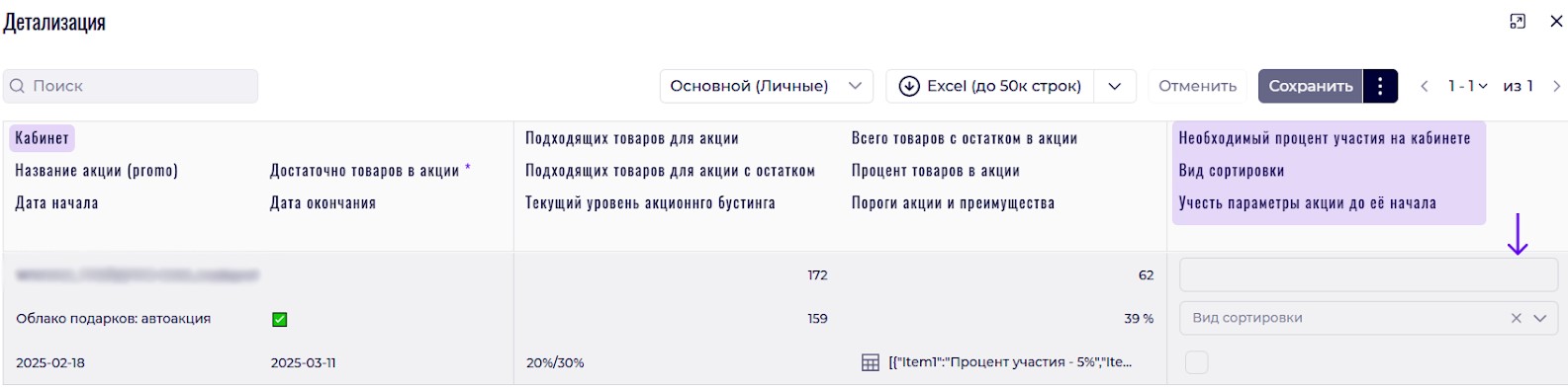Выберите необходимый процент участия всех артикулов на кабинет и вид сортировки. Вид сортировки — это параметр, который устанавливает приоритет участия артикула в акции, чтобы достичь необходимого процента участия.