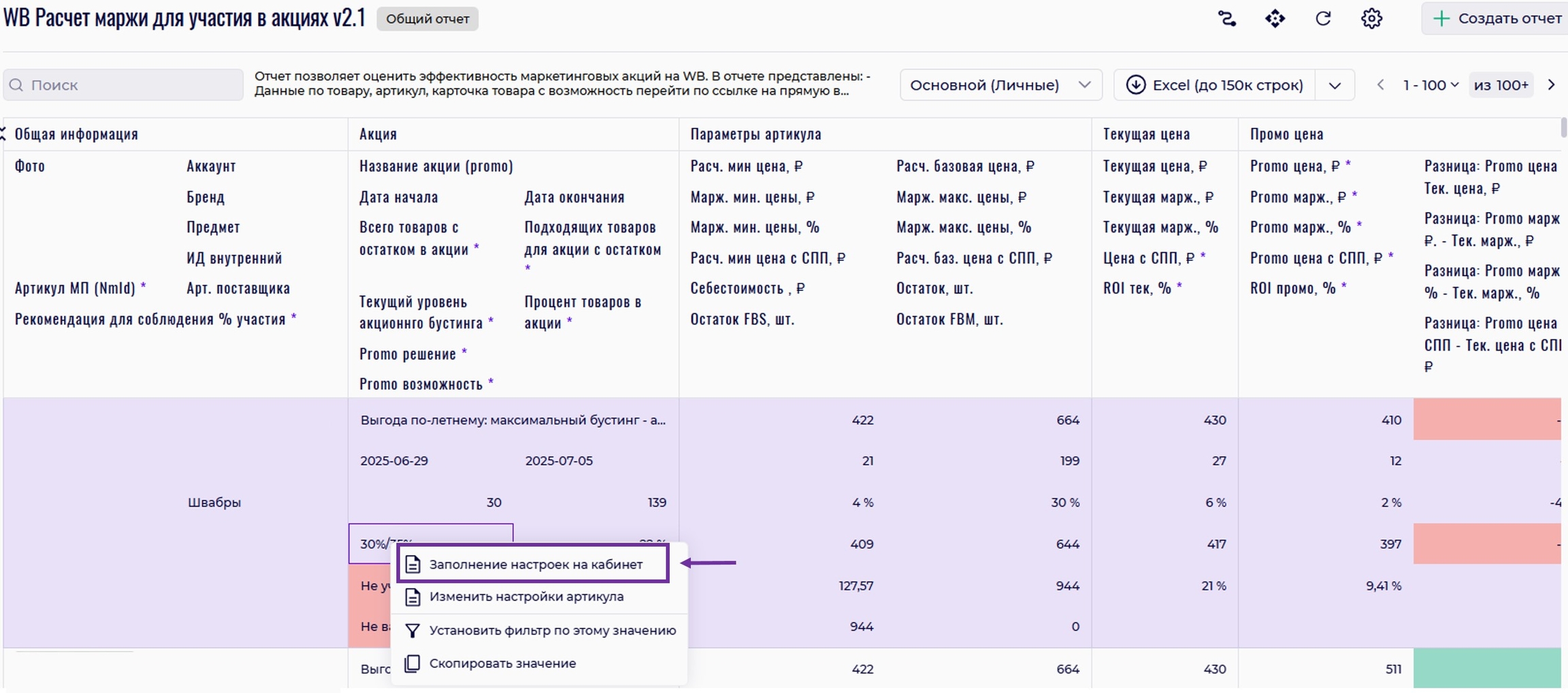 Чтобы настроить план участия в акциях, нажмите правой кнопкой мыши на любое значение → «Заполнение настроек на кабинет».