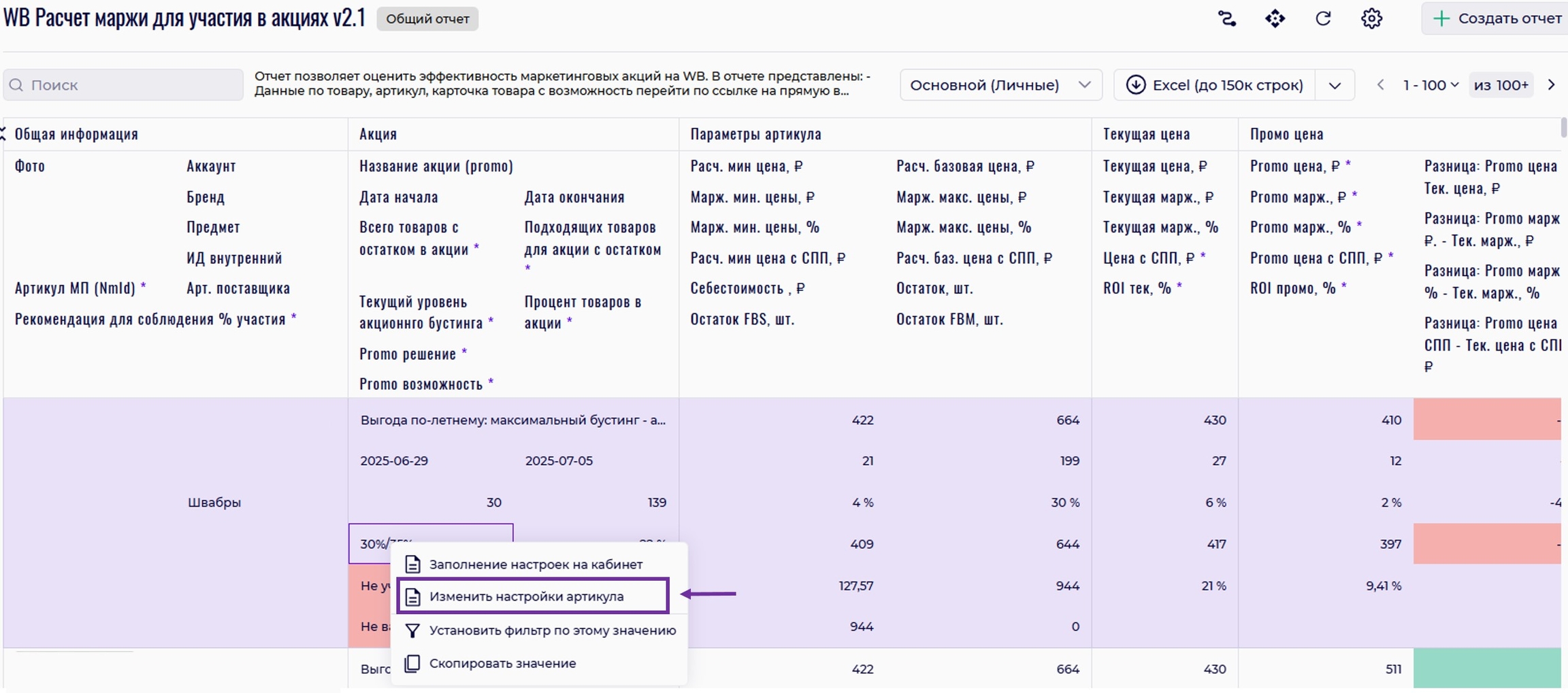 Из данного раздела также можно изменять настройки необходимого артикула для успешного участия в акциях — например, нужно незначительно скорректировать цену товара. Для этого в отчёте «WB Расчёт маржи для участия в акциях v2.1» щёлкните справа от артикула правой кнопкой мыши и выберите «Изменить настройки артикула».