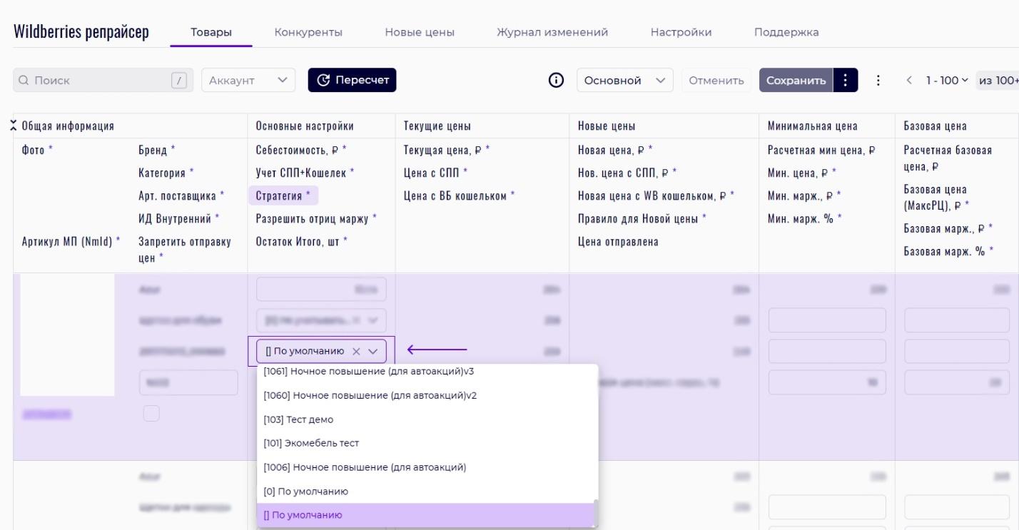 В столбце «Стратегия» проставьте номер подключаемой стратегии напротив нужных артикулов. Номер стратегии можно найти в раскрывающемся списке.