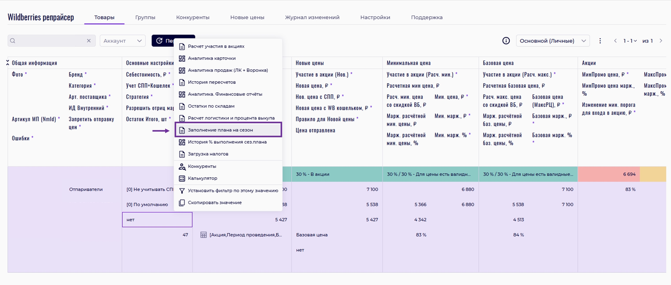Перейдите во вкладку «Товары» 🡪 «Заполнение плана на сезон».