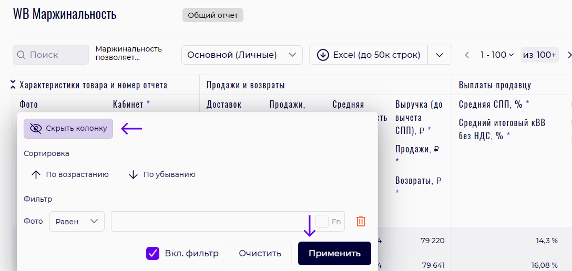 Чтобы посмотреть данные по марже за весь кабинет, скройте в разделе «Характеристики товара и номер отчёта» все столбцы, кроме «Кабинет».