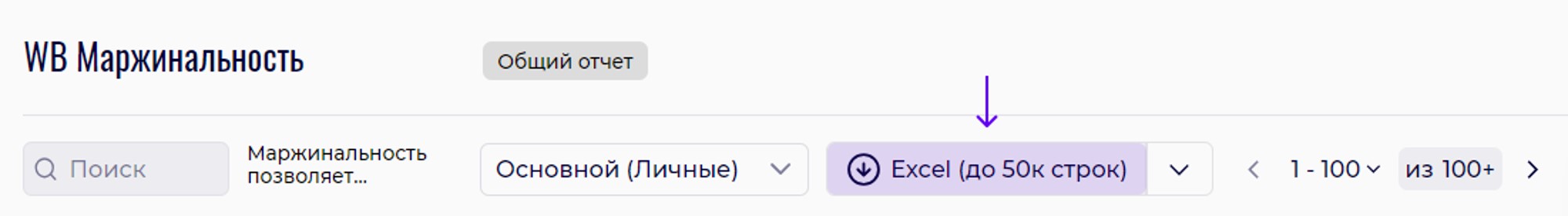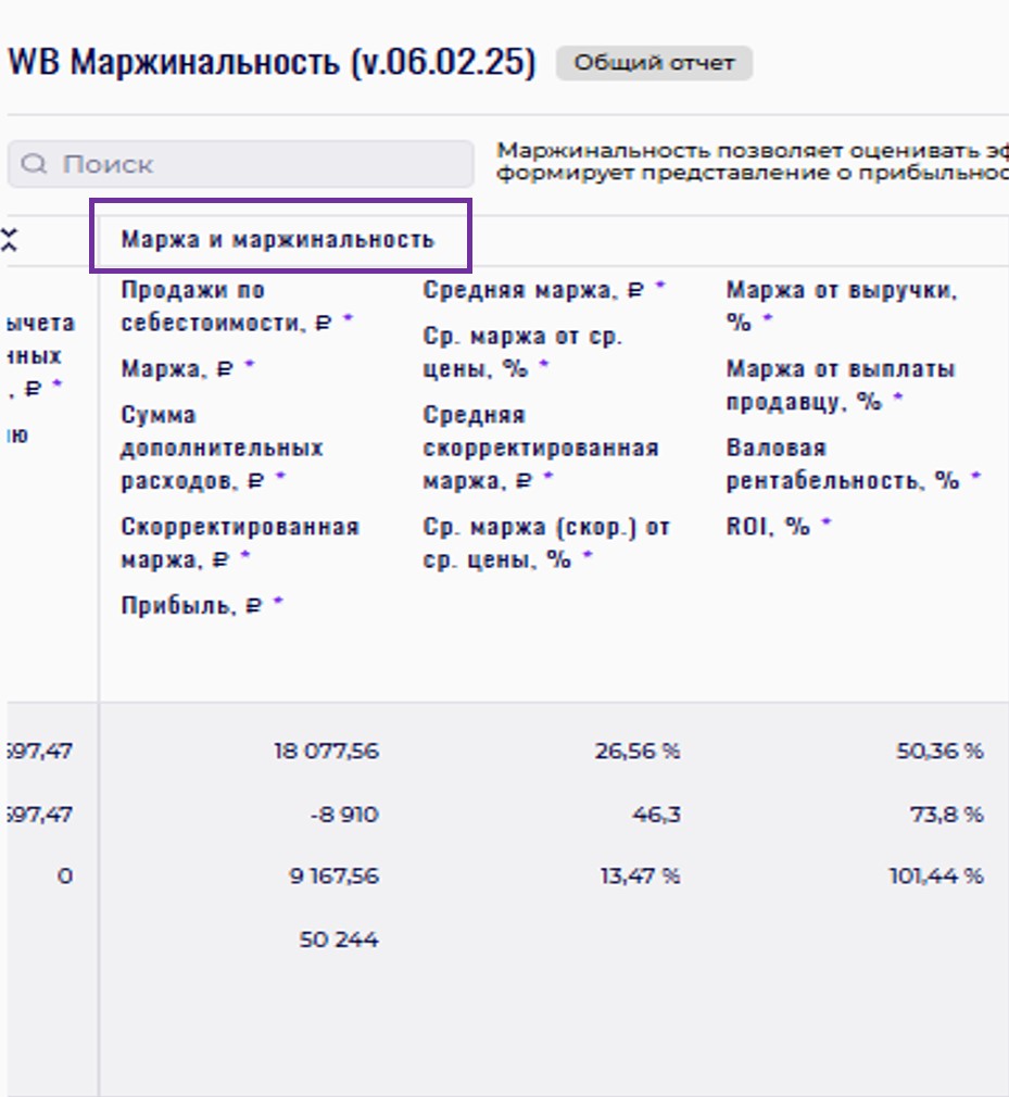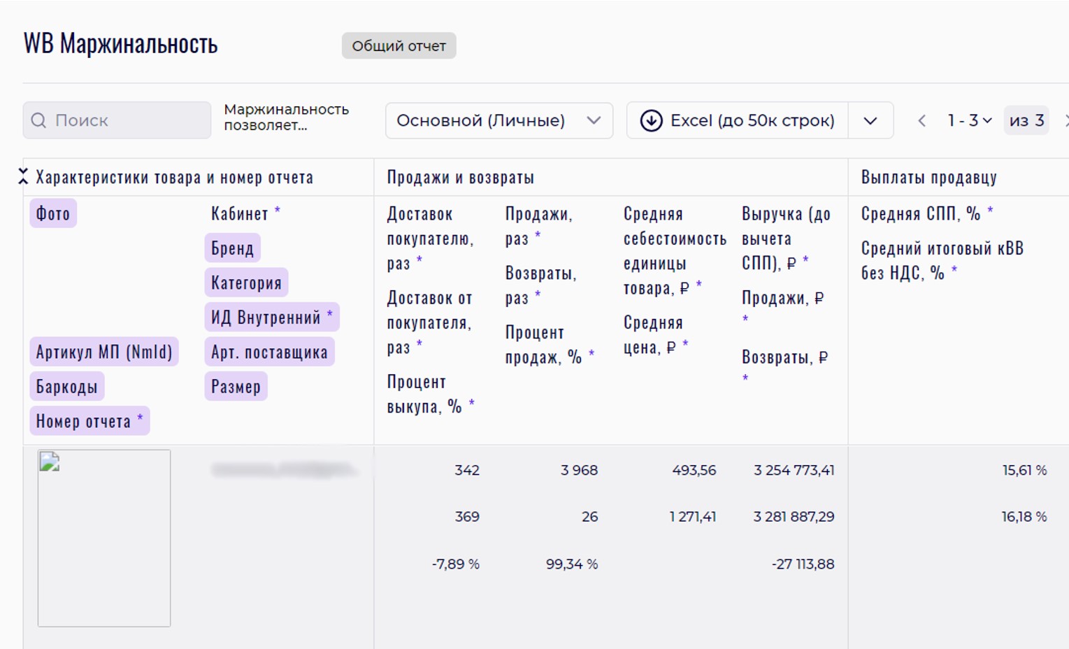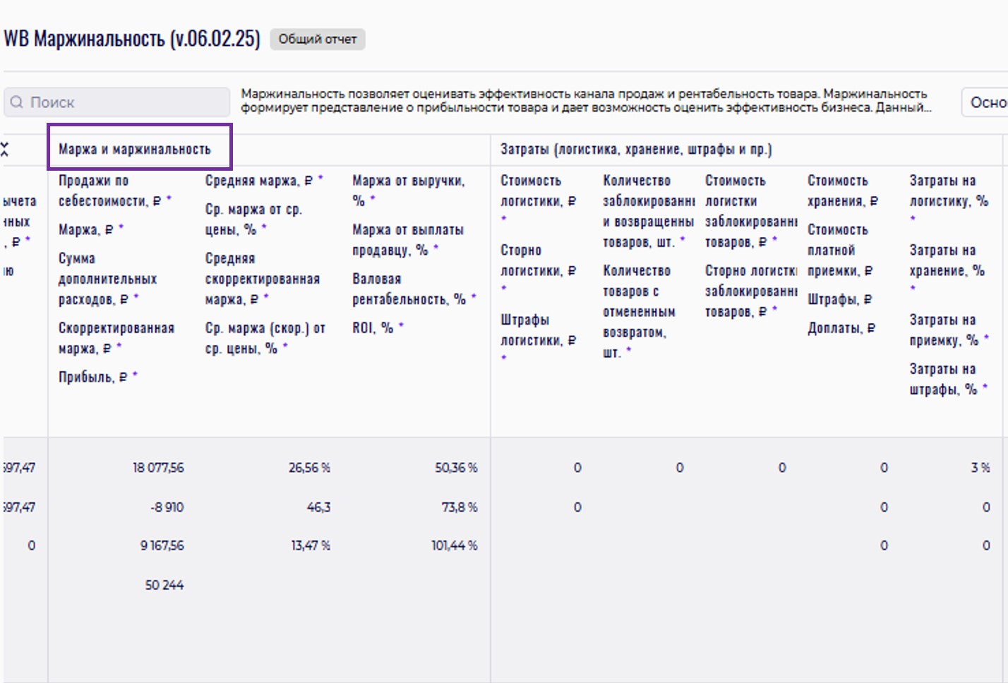 У каждого артикула в столбце «Маржа и маржинальность» указаны показатели маржи и другие параметры за выбранный период.