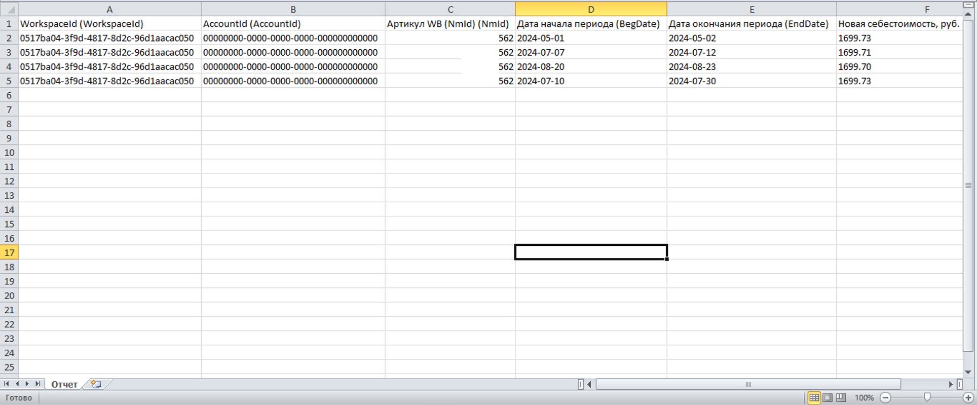 Затем необходимо скачать файл Excel. Откройте скачанный файл и измените себестоимость за нужные периоды (даже прошедшие периоды) и по необходимым артикулам.