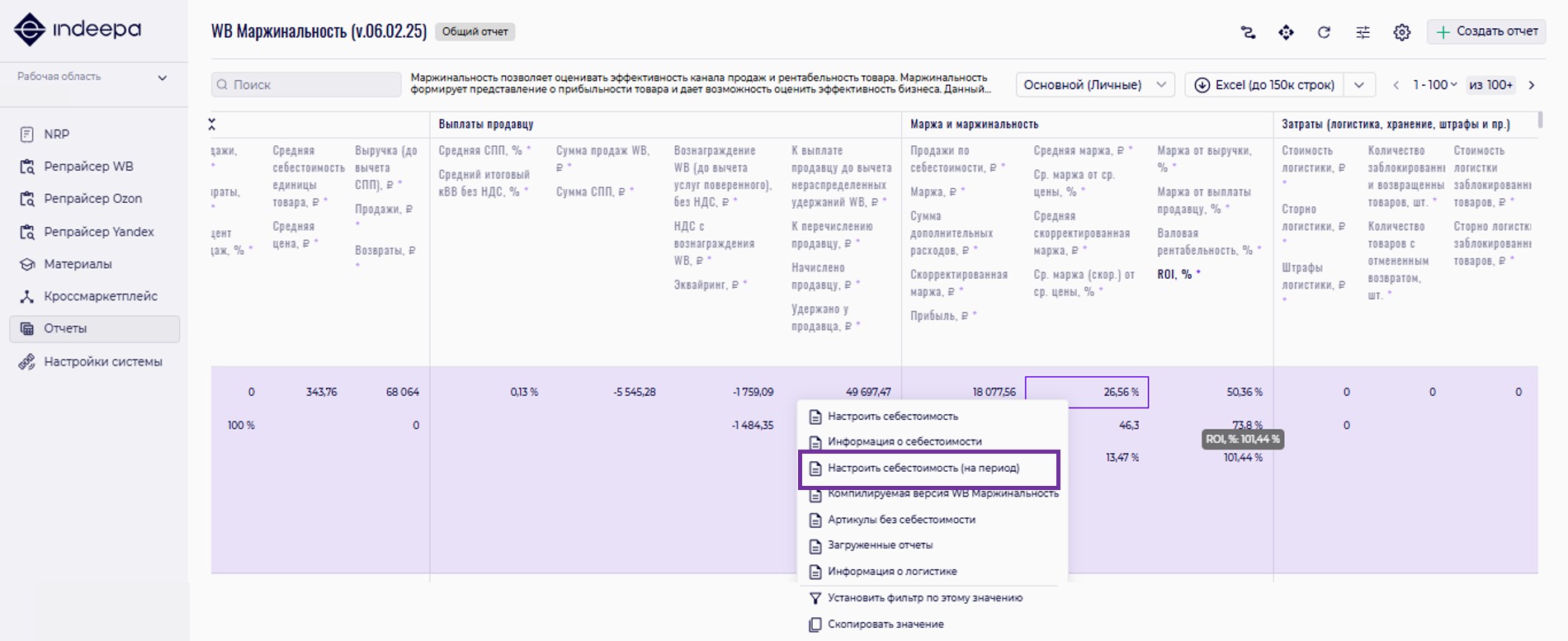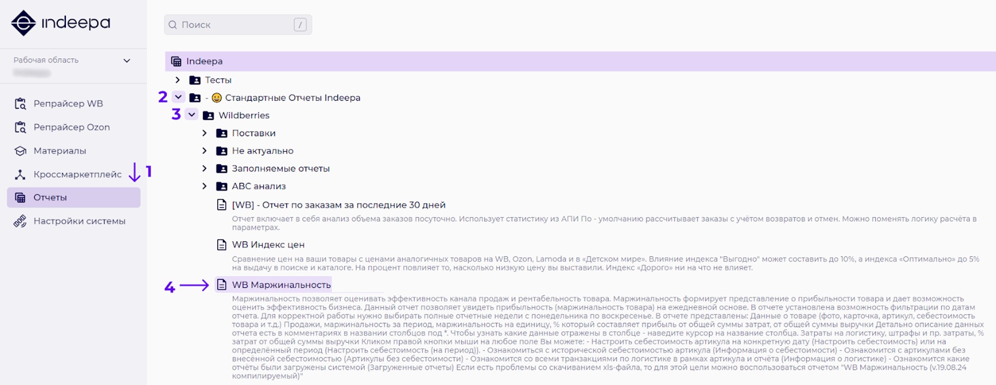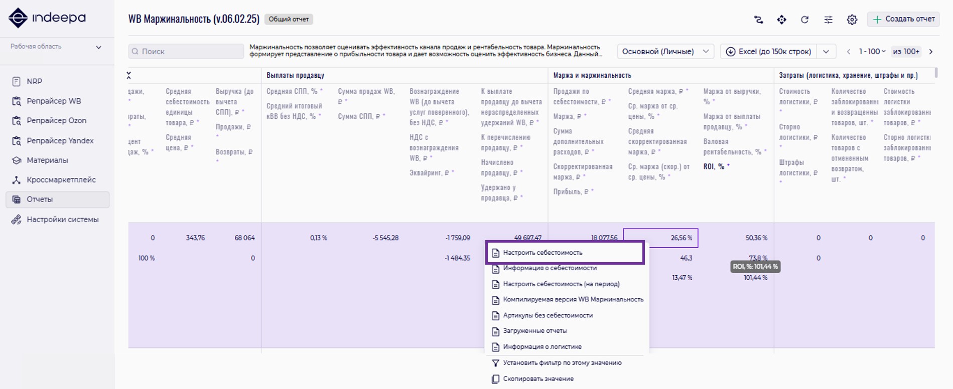 Перейдите в «Отчёты» → «Стандартные отчёты Indeepa» → «Wildberries» → «WB Маржинальность (v.06.02.25)»