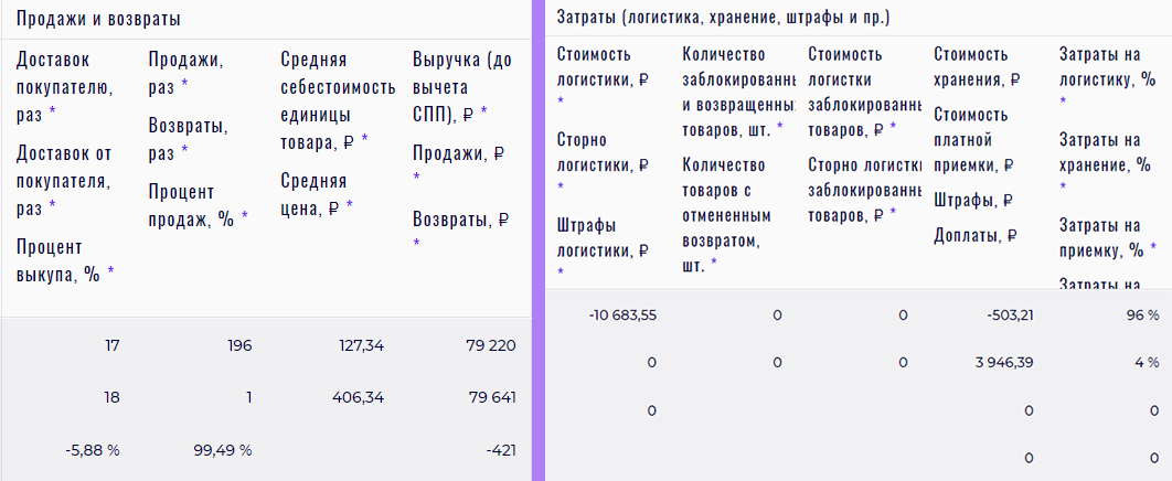 Также в отчёте есть информация о затратах, продажах и возвратах.