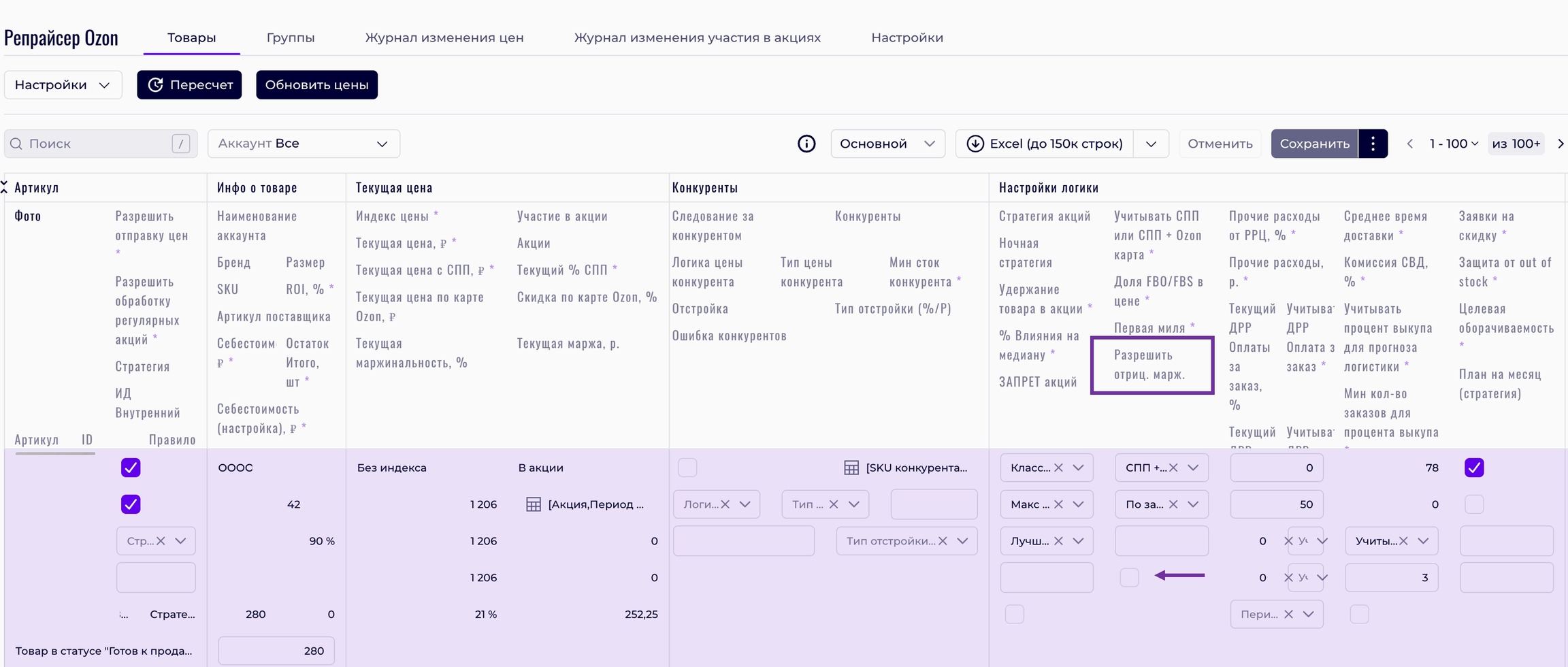Чтобы включить возможность отрицательной маржинальности, во вкладке «Товары» в столбце «Настройка логики» поставьте галочку.