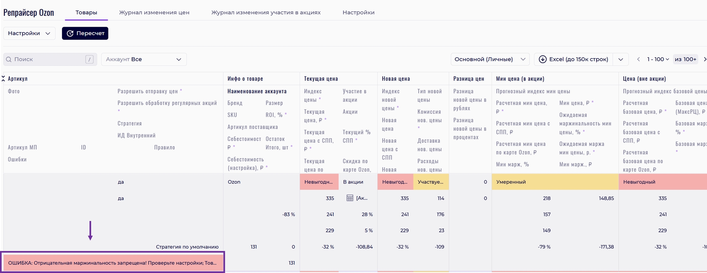 Важно! Если при настройке артикула установить параметр «минимальная маржа» равным отрицательному числу (например, −10), но не разрешить использование отрицательной маржинальности, то репрайсер выдаст ошибку.