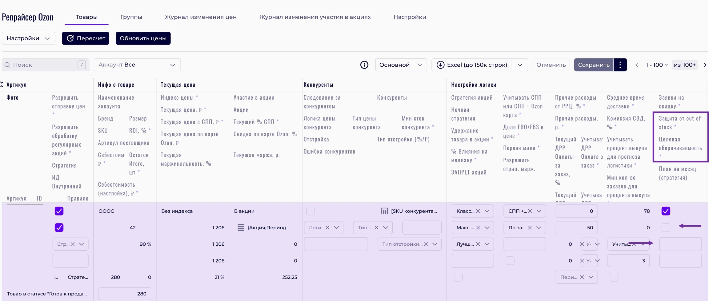 Настройку по определенным артикулам можно выполнить во вкладке «Товары» в столбце «Настройки логики».